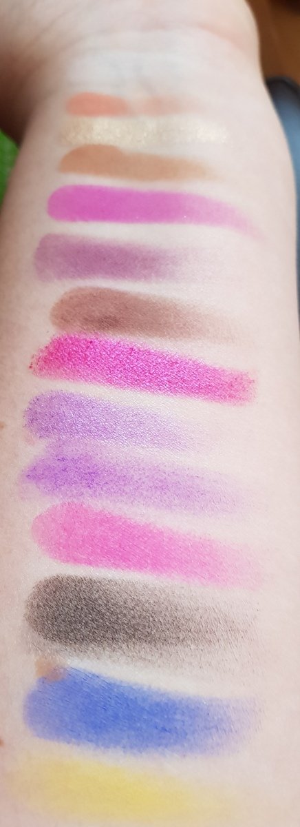 Swatches am Arm, hinten die neutralen, vorne die Knallfarben