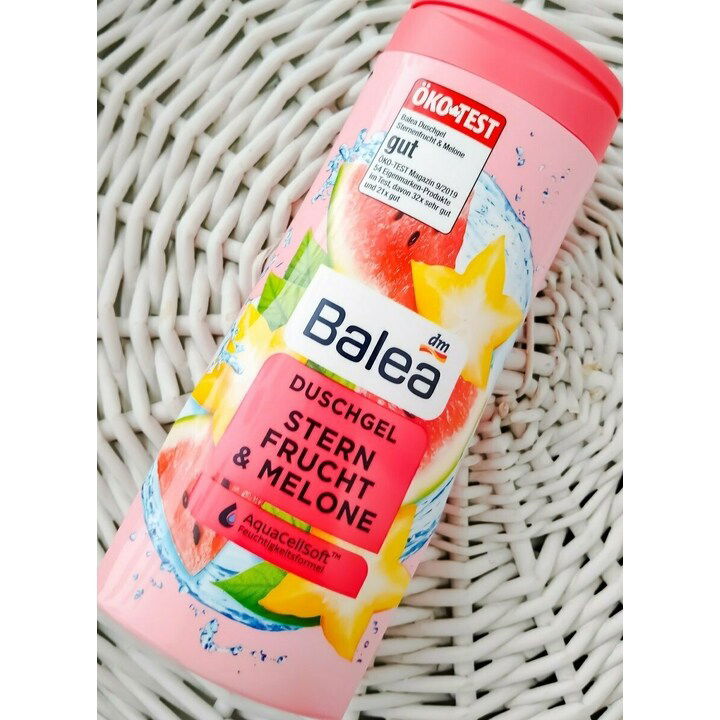 Dieses Duschgel suchte ich mir für Umsonst aus dank der dm-App. Irgendwie ist mir im Moment sehr nach erfrischender Frucht (der Sommereffekt *g*), also wählte ich aus den vielen Varianten der kunterbunten Baleas das hier aus.