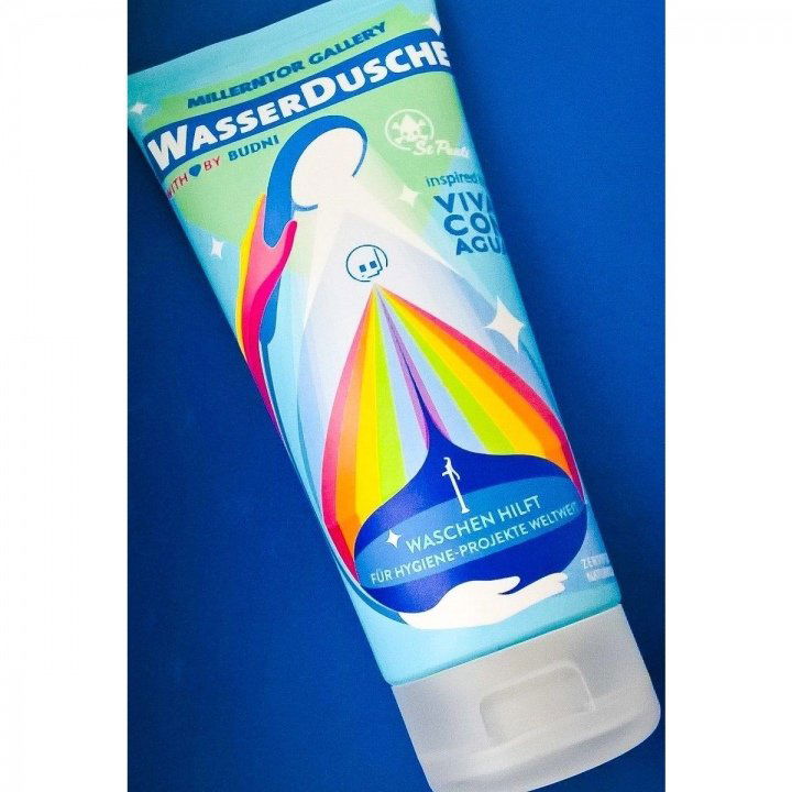 Millerntor Gallery ist ein St.-Pauli-Festival, das Viva con Agua unterstützt. Viva con Agua unterstützt wiederum Wasser-, Sanitär- und Hygieneprojekte auf der ganzen Welt. Diese Dusche, die ein gemeinsames Produkt von Budni und Millerntor Gallery ist, steht also zurecht unter dem Motto "Waschen hilft -- Für Hygiene-Projekte weltweit". Eine runde Sache.
