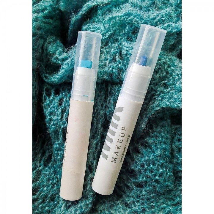 Diese Lidschatten in Stiftform habe ich vom Grabbeltisch bei TK. Die Farben haben mich magisch angezogen: Das Dunkelblau (Hustler) und das Türkis (Model/DJ) sind mein Beuteschema und ich bin begeistert, wie brillant und intensiv die Farben am Auge herauskommen. Wow! Damit kann ich was anfangen.