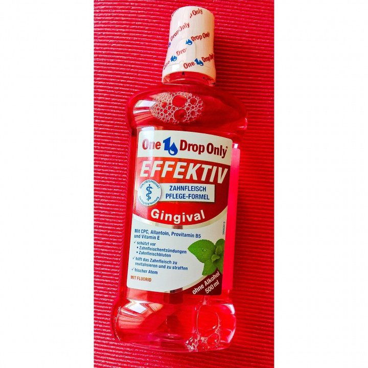 Übrigens: Trotz des Markennamens braucht man hier mehr als einen Tropfen. Das hier ist kein Konzentrat, sondern eine gebrauchsfertige Mundspülung, man benötigt pro Mal etwa eine halbe Verschlusskappe.