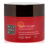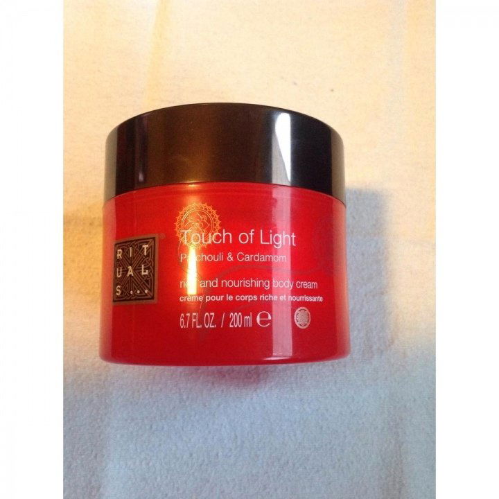 ....lecker! Wie man schon bemerkt hat...ich liebe die Produkte von Rituals. Hier ...Touch of Light. Es riecht orientalisch nach Patchouli und Cardamon.Man wird jetzt nicht erschlagen vom Duft aber unauffällig ist er nicht.Morgens eingecremt kann man ihn bis zum Nachmittag gut wahrnehmen. Die reichhaltige Bodycream lässt sich gut verteilen,zieht schnell ein und hinterlässt ein angenehmes Gefühl auf der Haut.Die Konsistenz ist der einer Creme,also fester. Der Tiegel ist in einem warmen rot gehalten,der Deckel in schwarz. 200ml sind enthalten,der Preis etwa 15€.