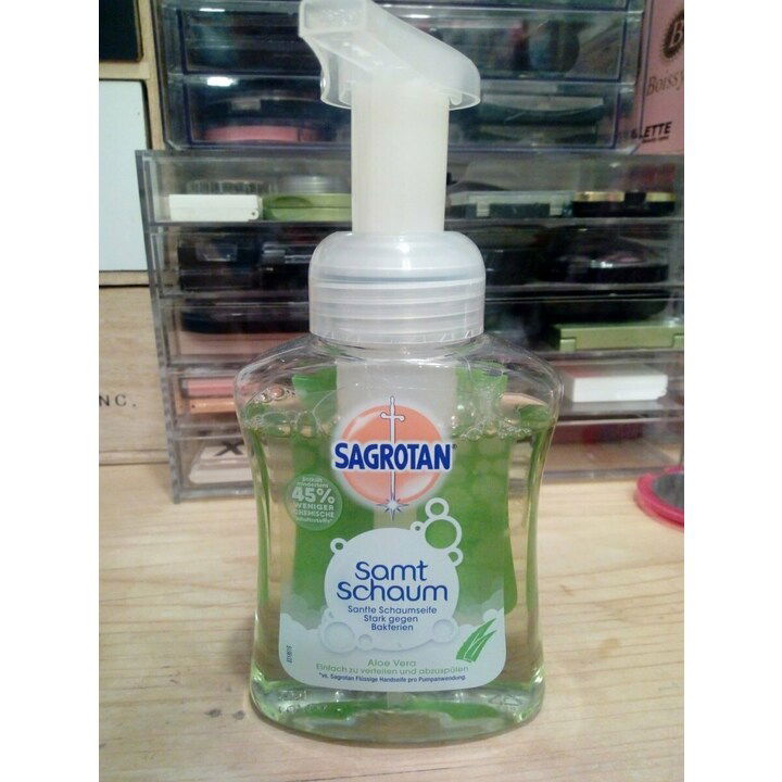 Mit einem Rabattcoupon habe ich mal irgendwann diese Schaumseife mitgenommen, auch, weil ich Aloe ganz gern mag. Jetzt war die alte Handseife alle und der Schaum kam dran.