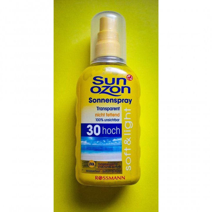 Testkandidat eins: Das Sun Ozon Soft & Light Sonnenspray 30 aus dem Eigenmarkensortiment von Rossmann. Kurz zu den Produktinfos des Herstellers: Ist transparent, fettet nicht, ist 100% unsichtbar, wasserfest, bietet UVA- und UVB-Schutz, entfaltet einen zuverlässigen Schutz sofort, spendet Feuchtigkeit.